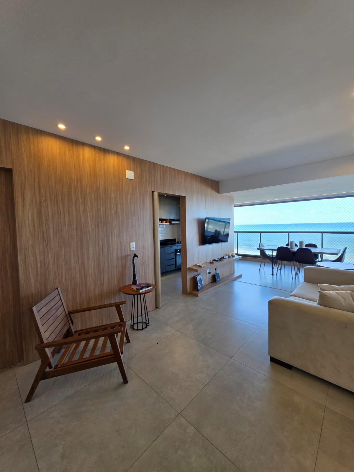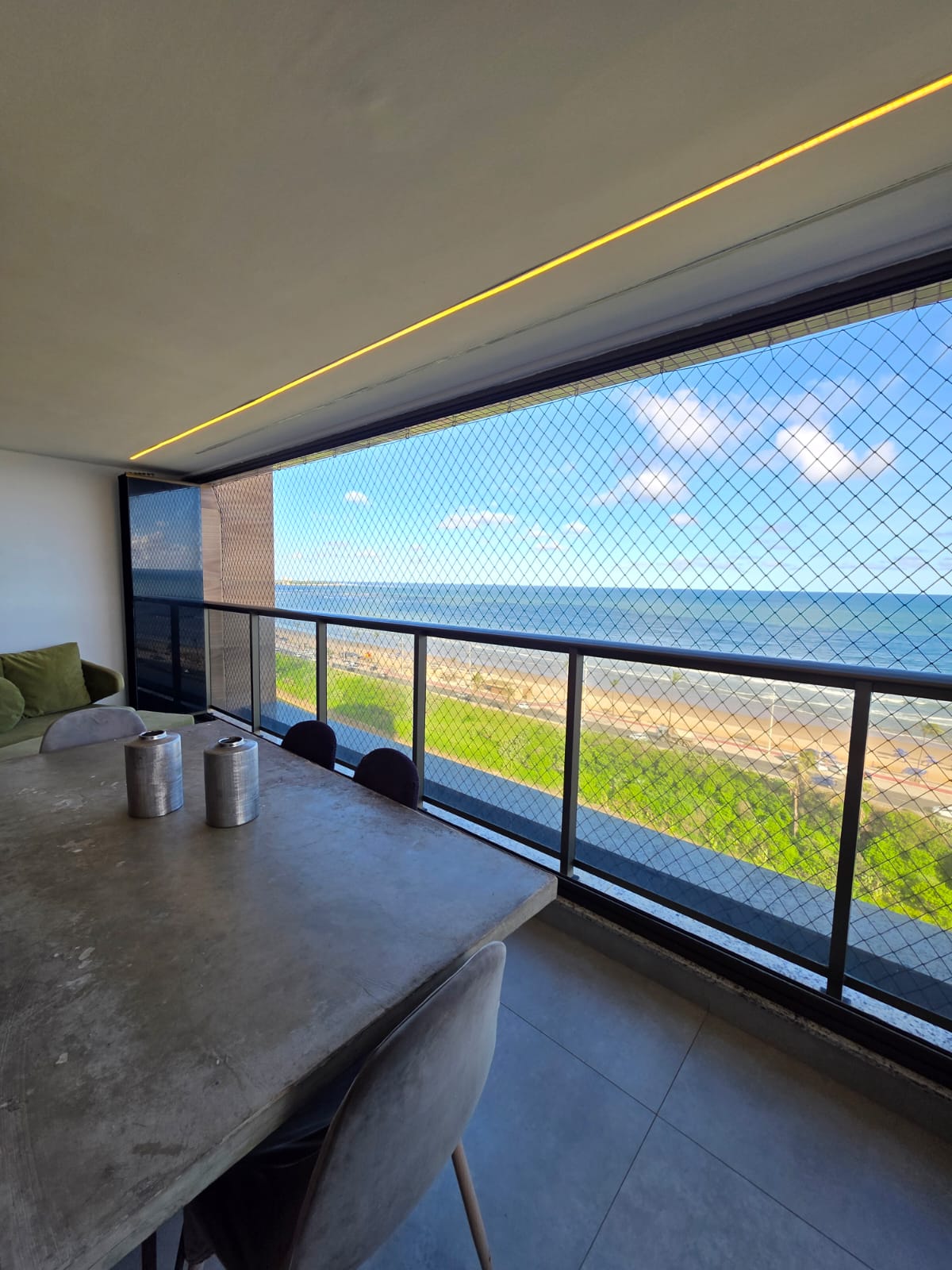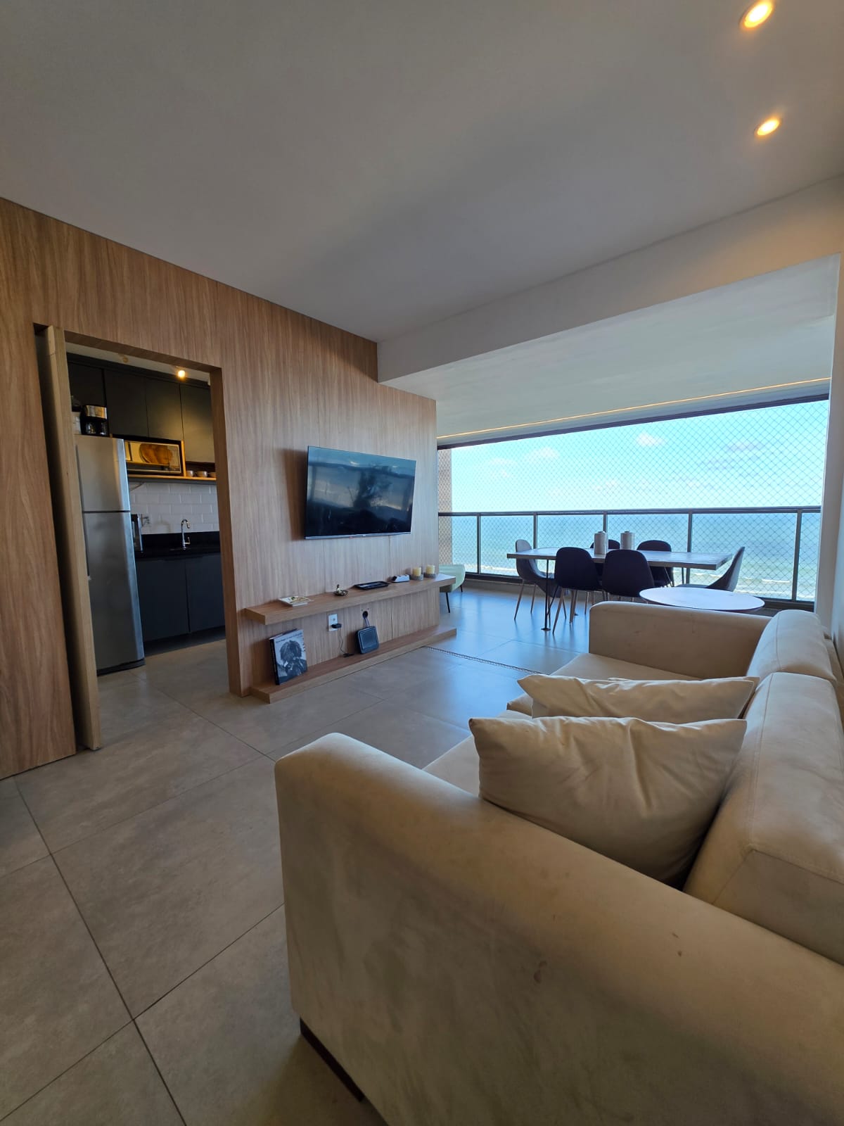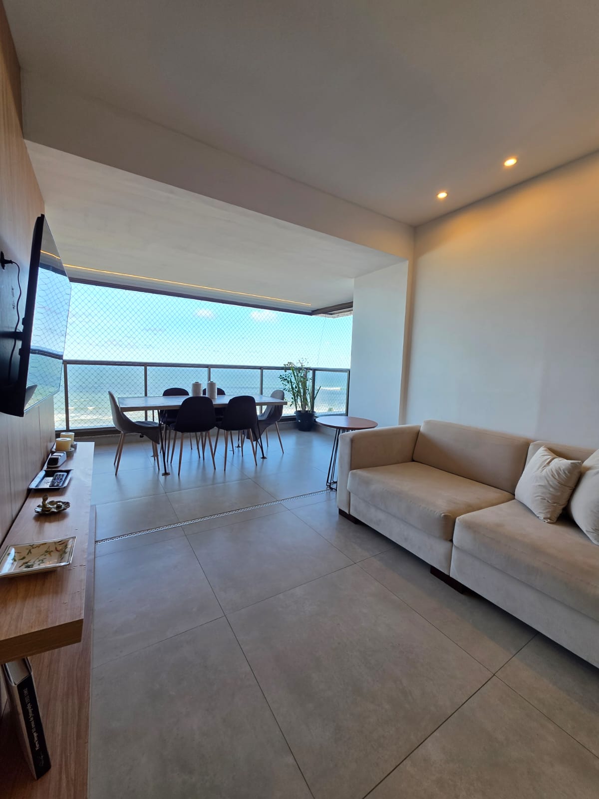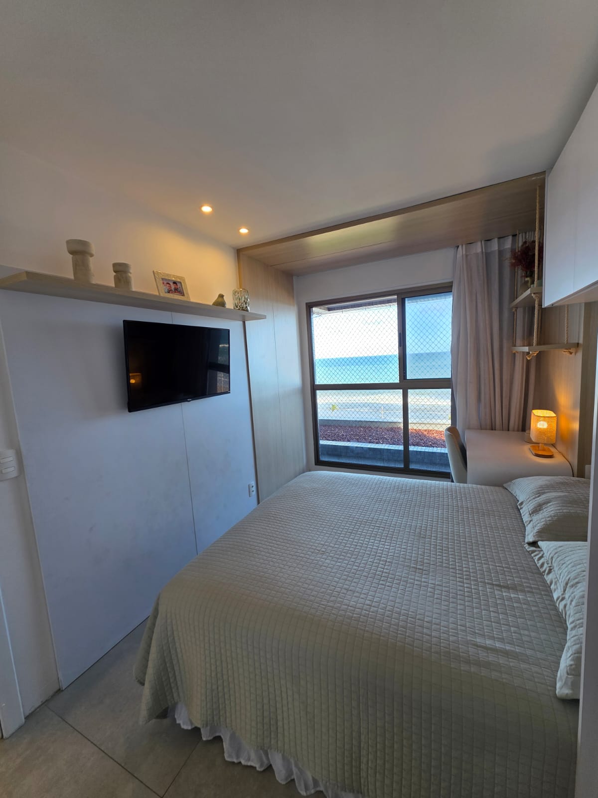 São 3/4 sendo 1 suíte, 88m², decorado, vista mar permanente, nascente, andar alto, varanda com fechamento de vidro, projeto de gesso e iluminação, armários planejados, 1 vaga de garagem.