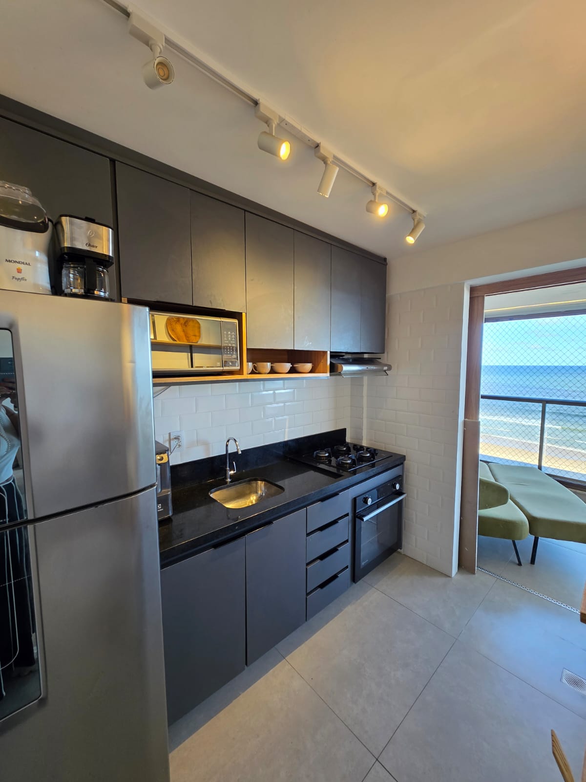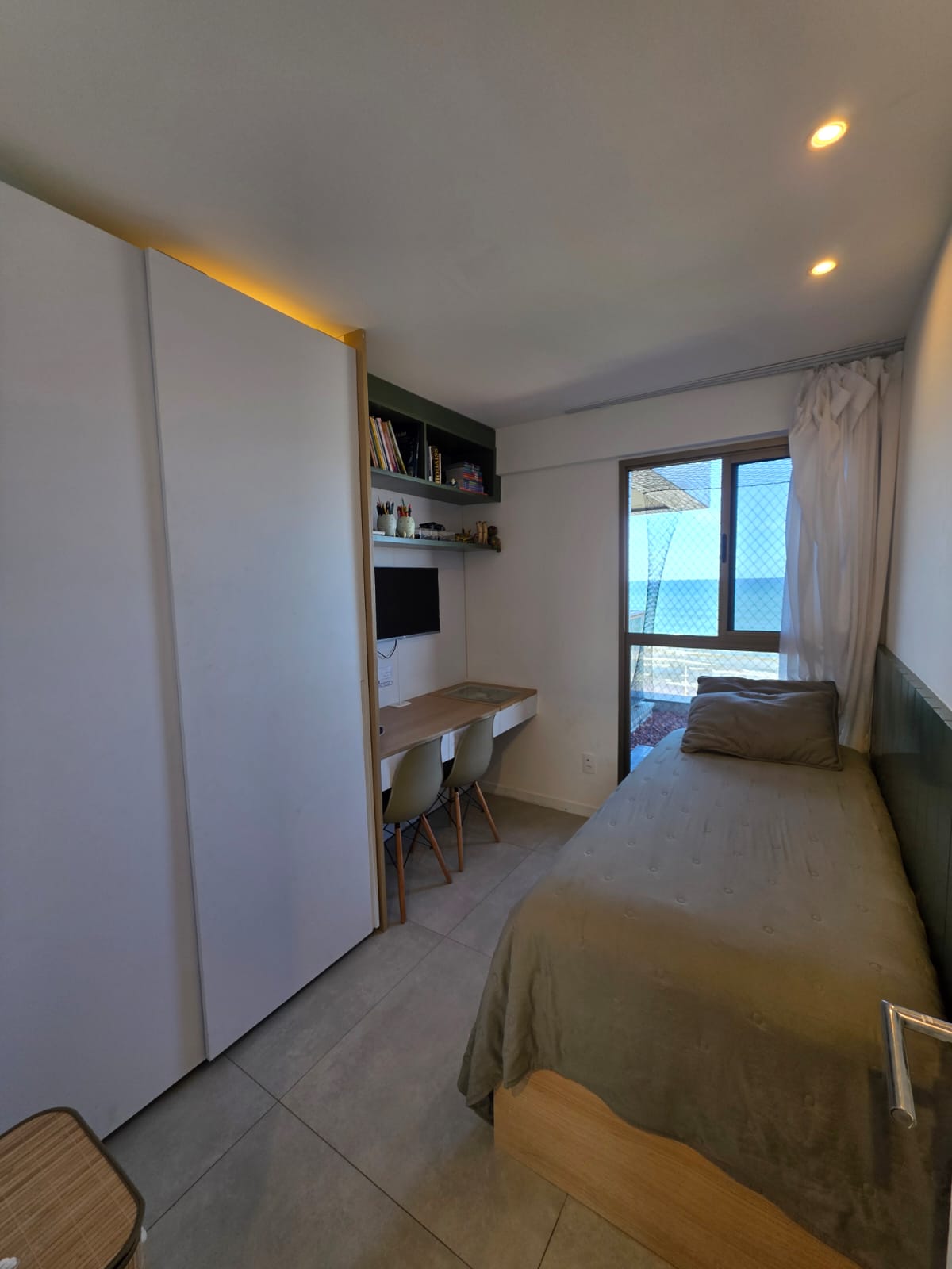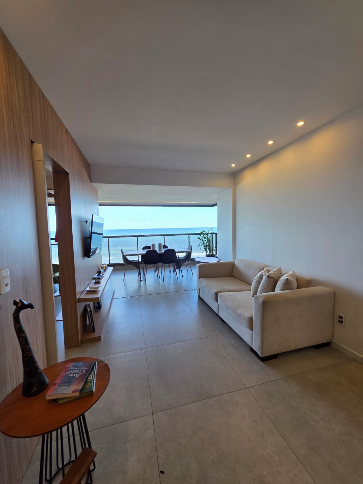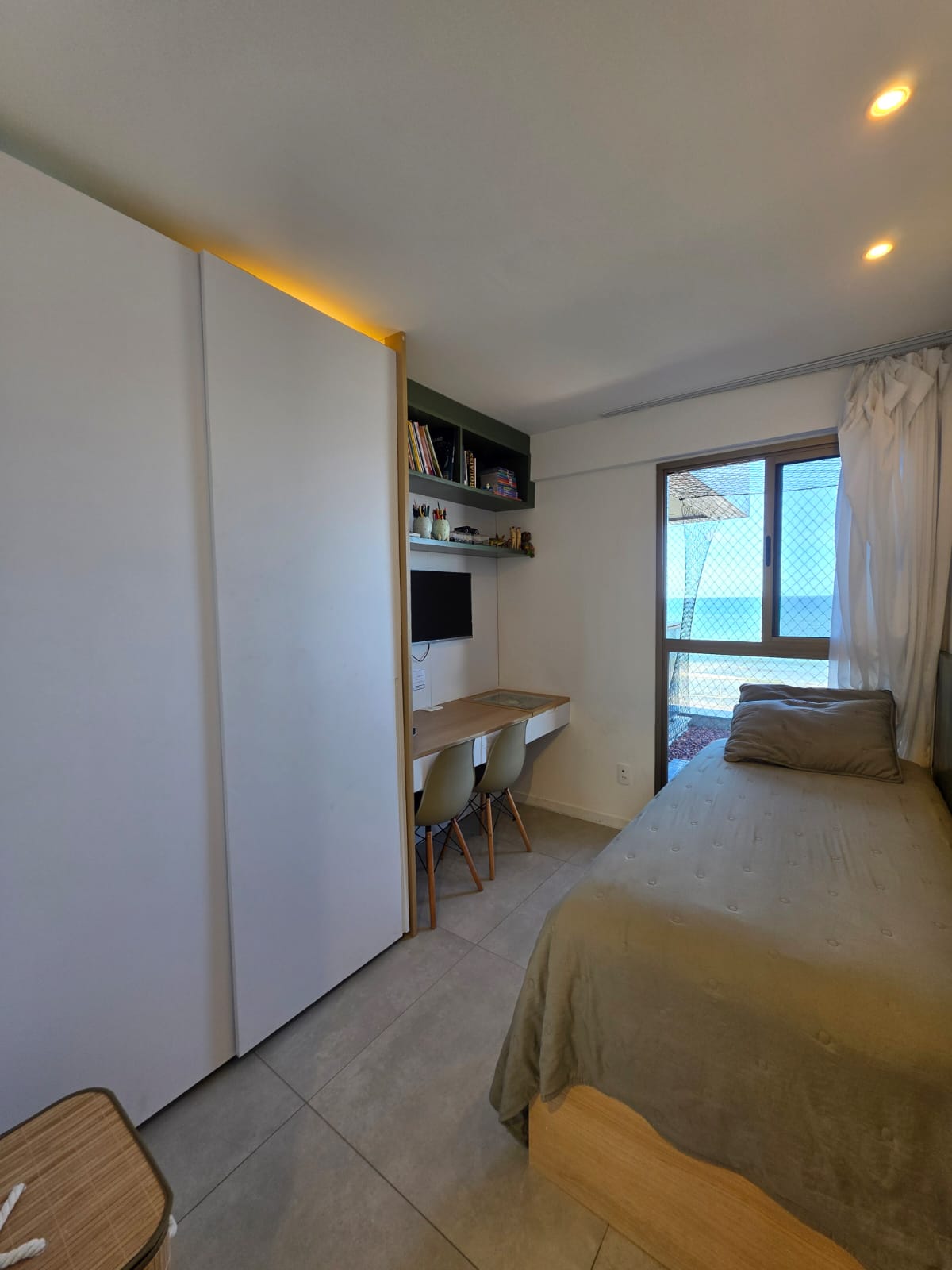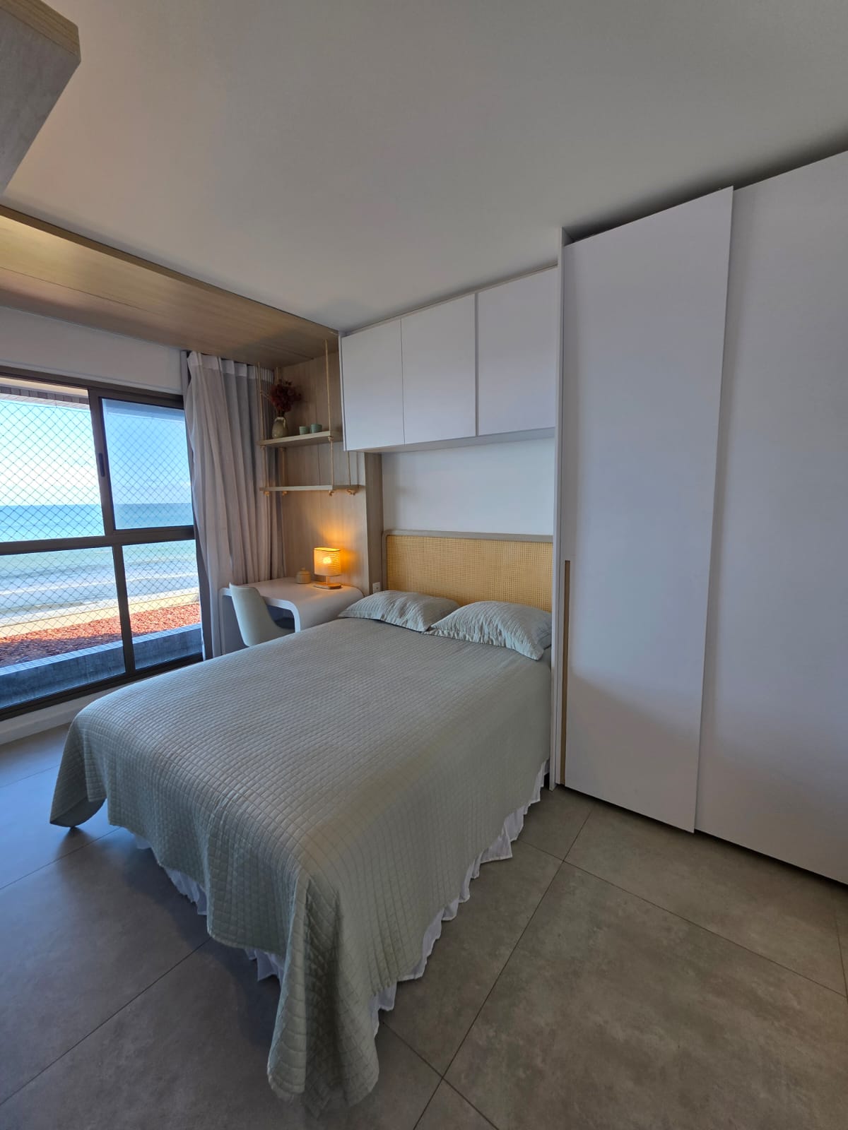 São 3/4 sendo 1 suíte, 88m², decorado, vista mar permanente, nascente, andar alto, varanda com fechamento de vidro, projeto de gesso e iluminação, armários planejados, 1 vaga de garagem.