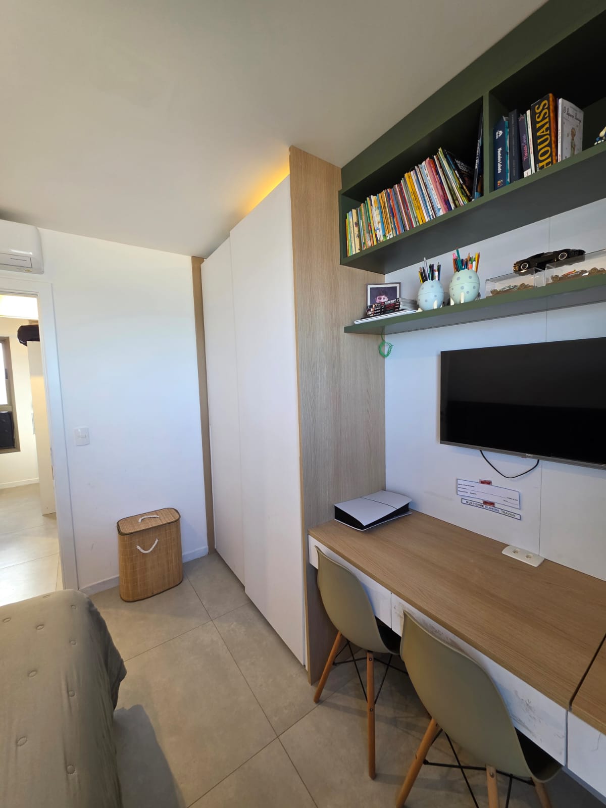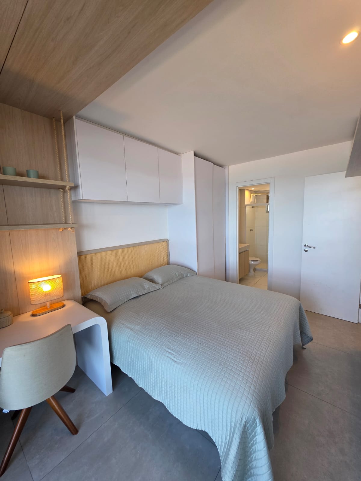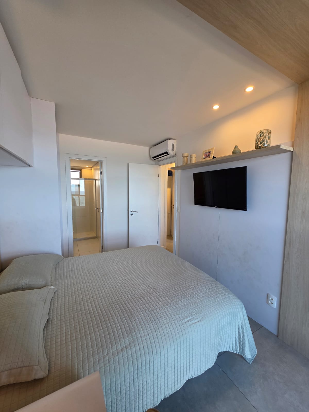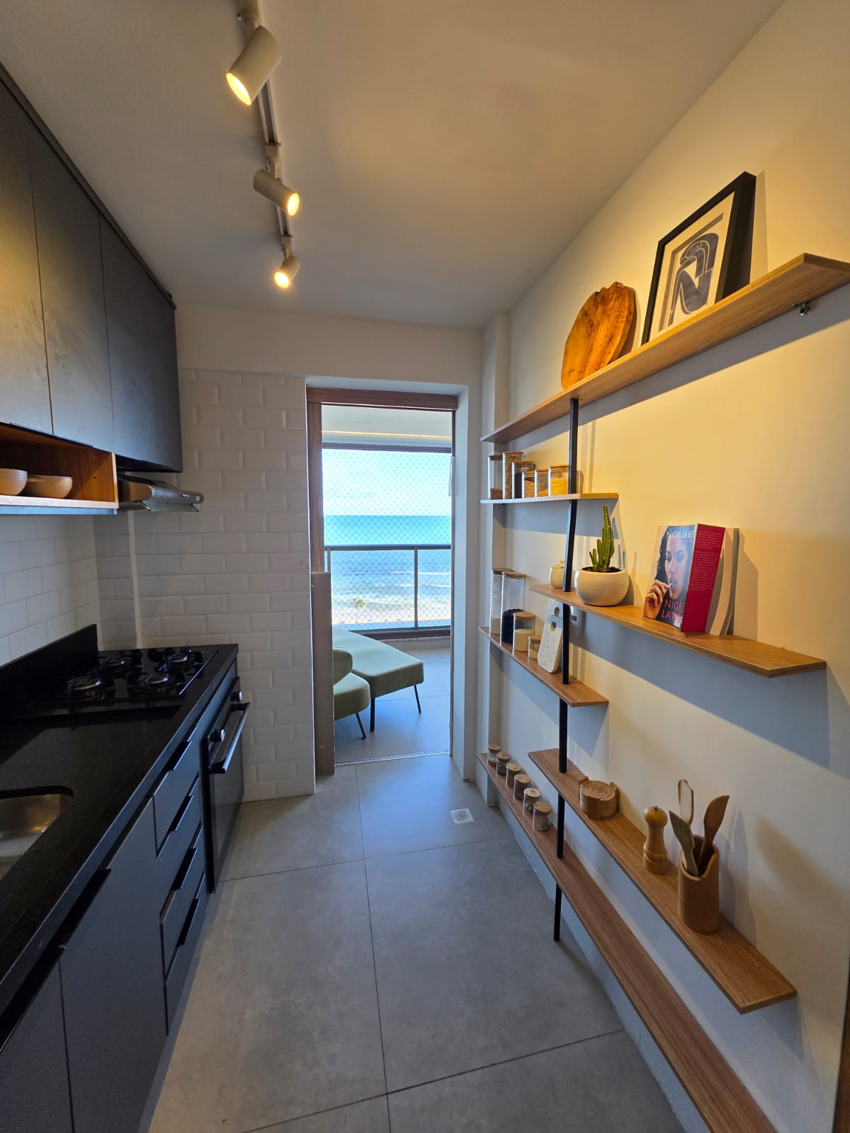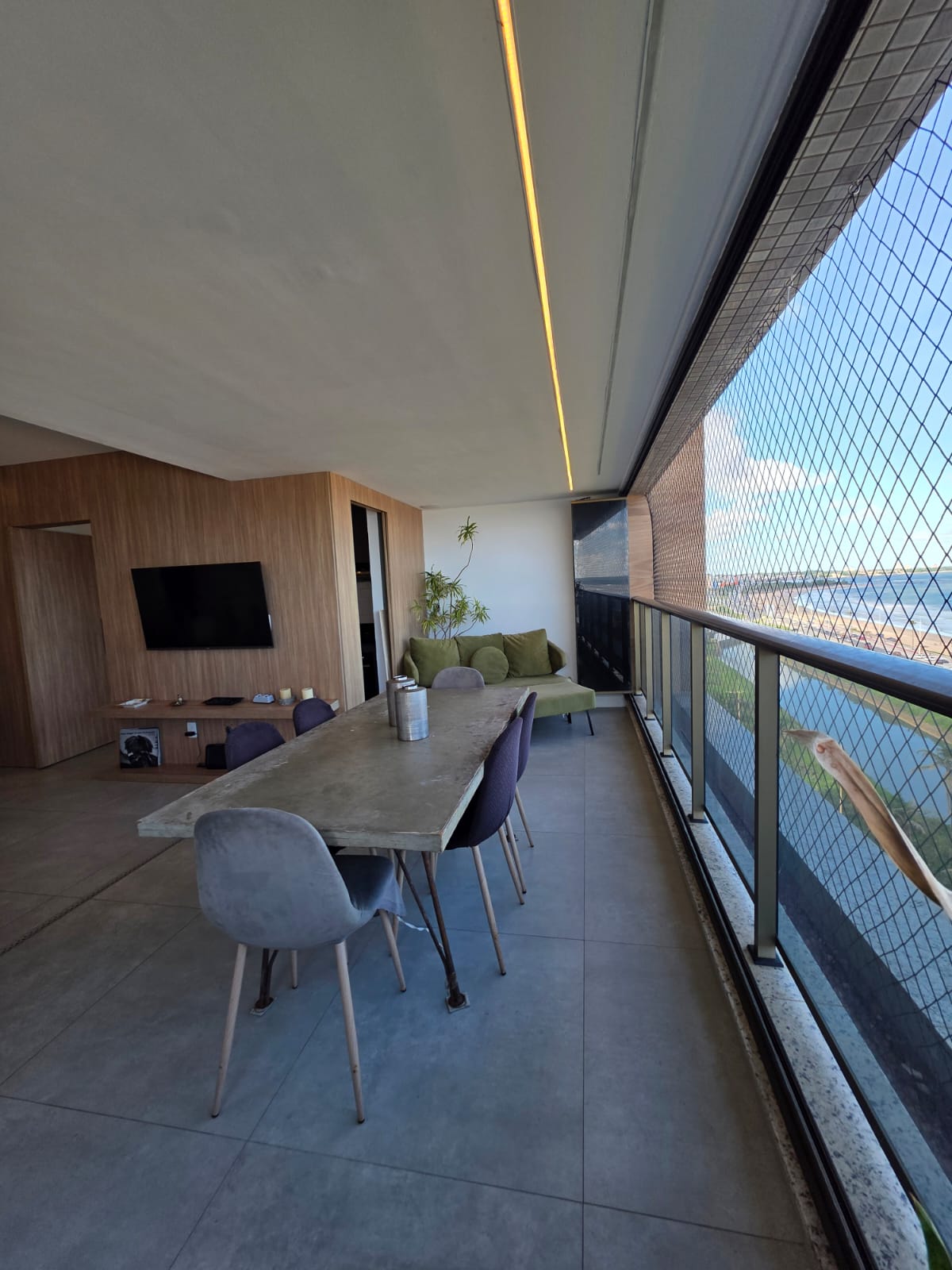 São 3/4 sendo 1 suíte, 88m², decorado, vista mar permanente, nascente, andar alto, varanda com fechamento de vidro, projeto de gesso e iluminação, armários planejados, 1 vaga de garagem.