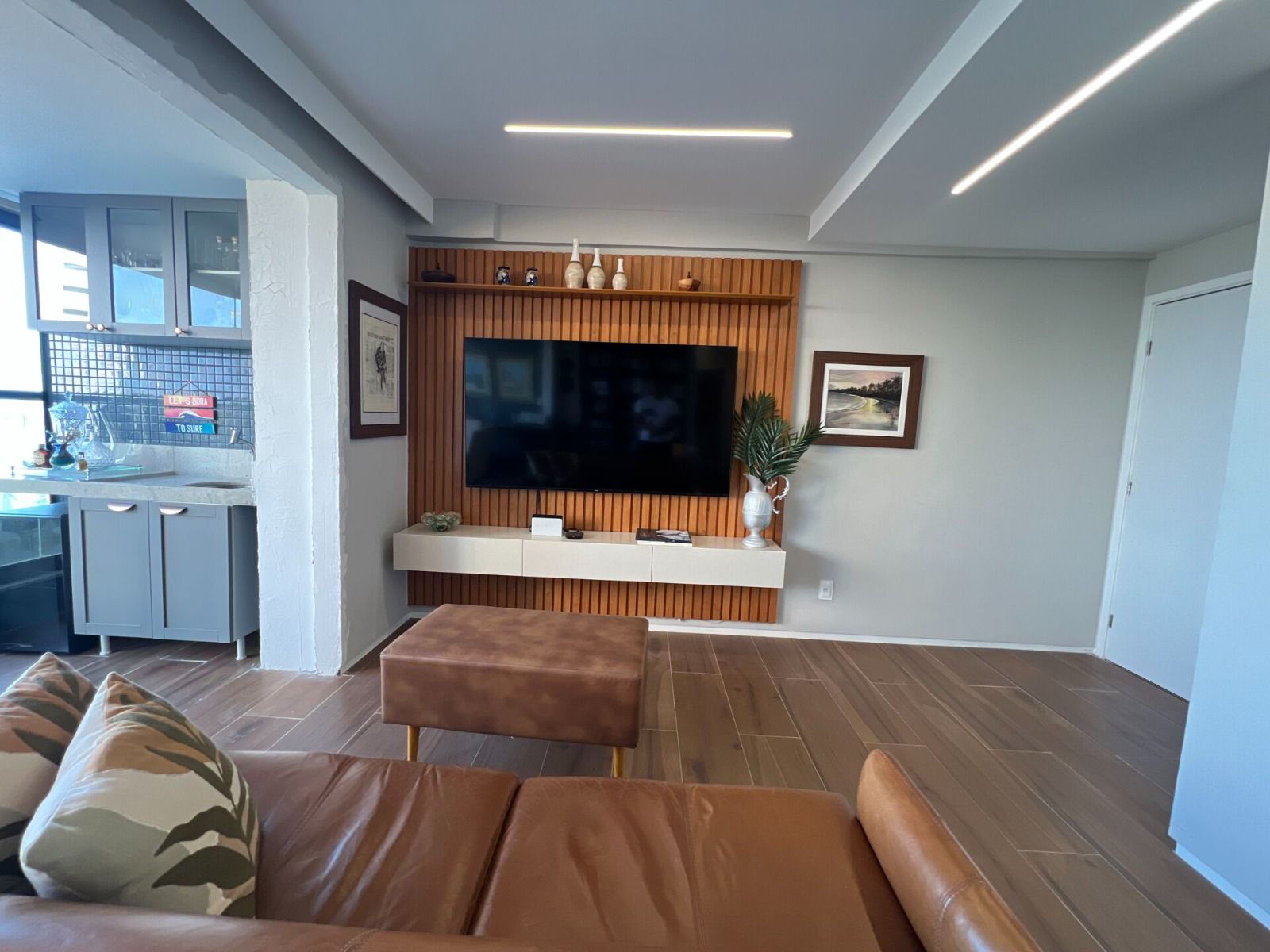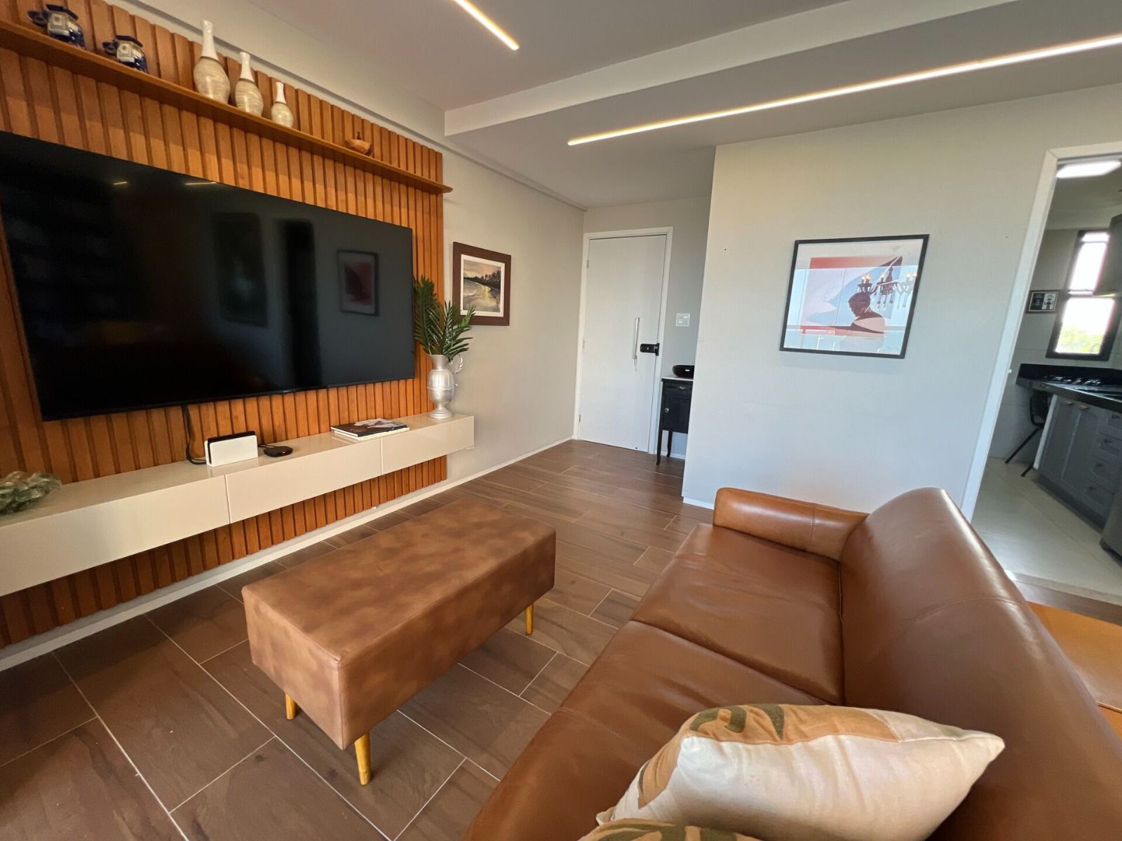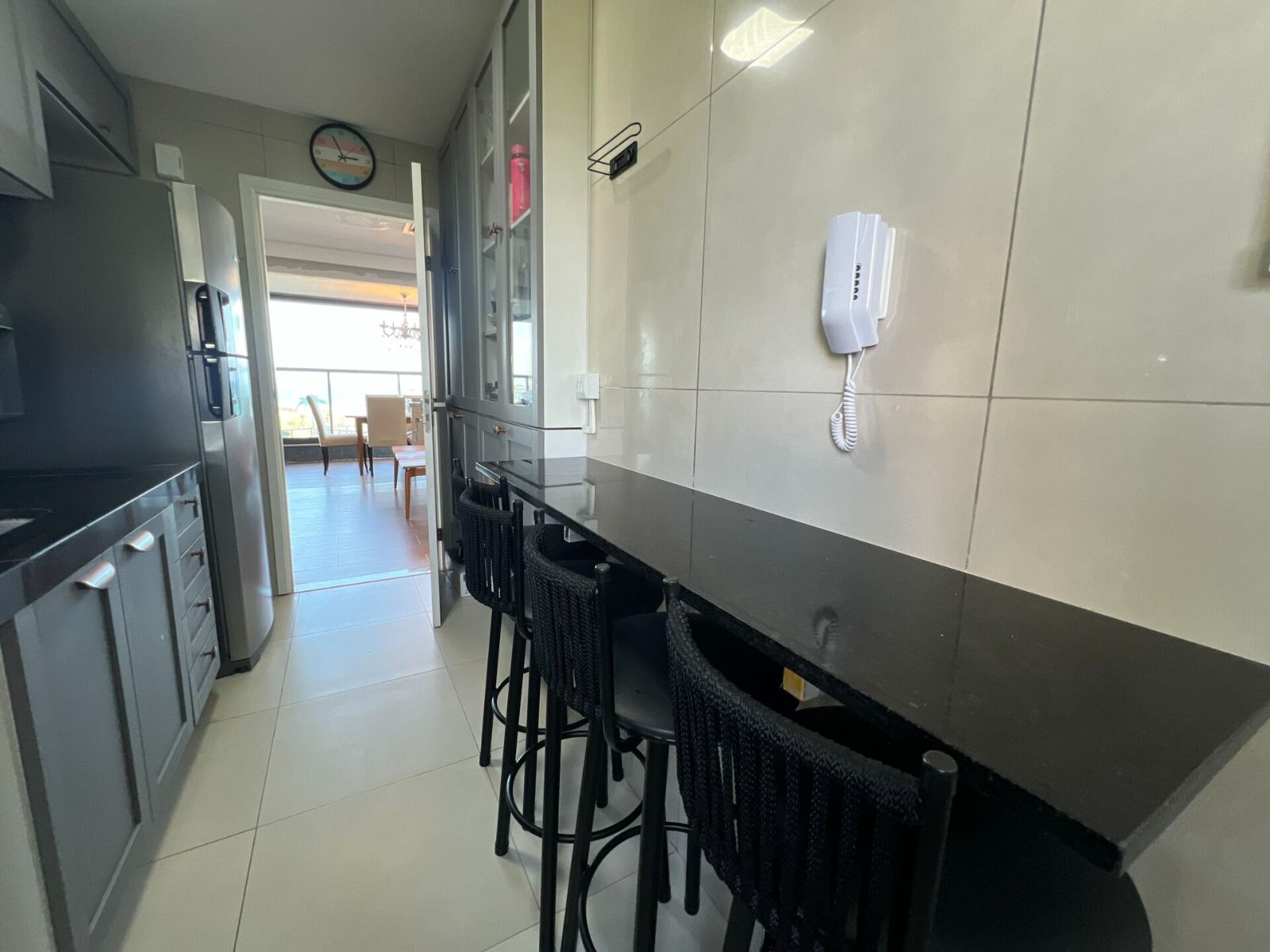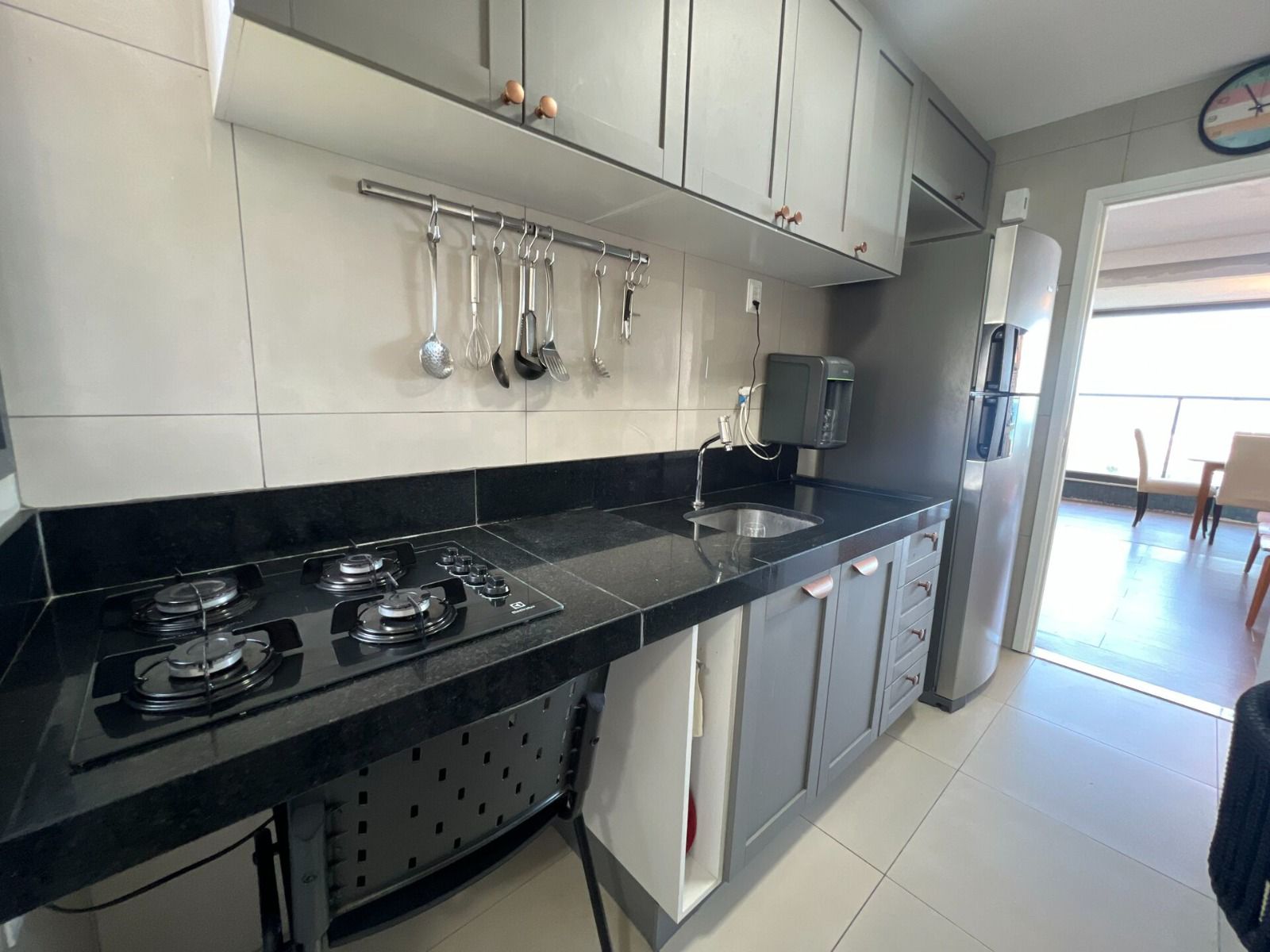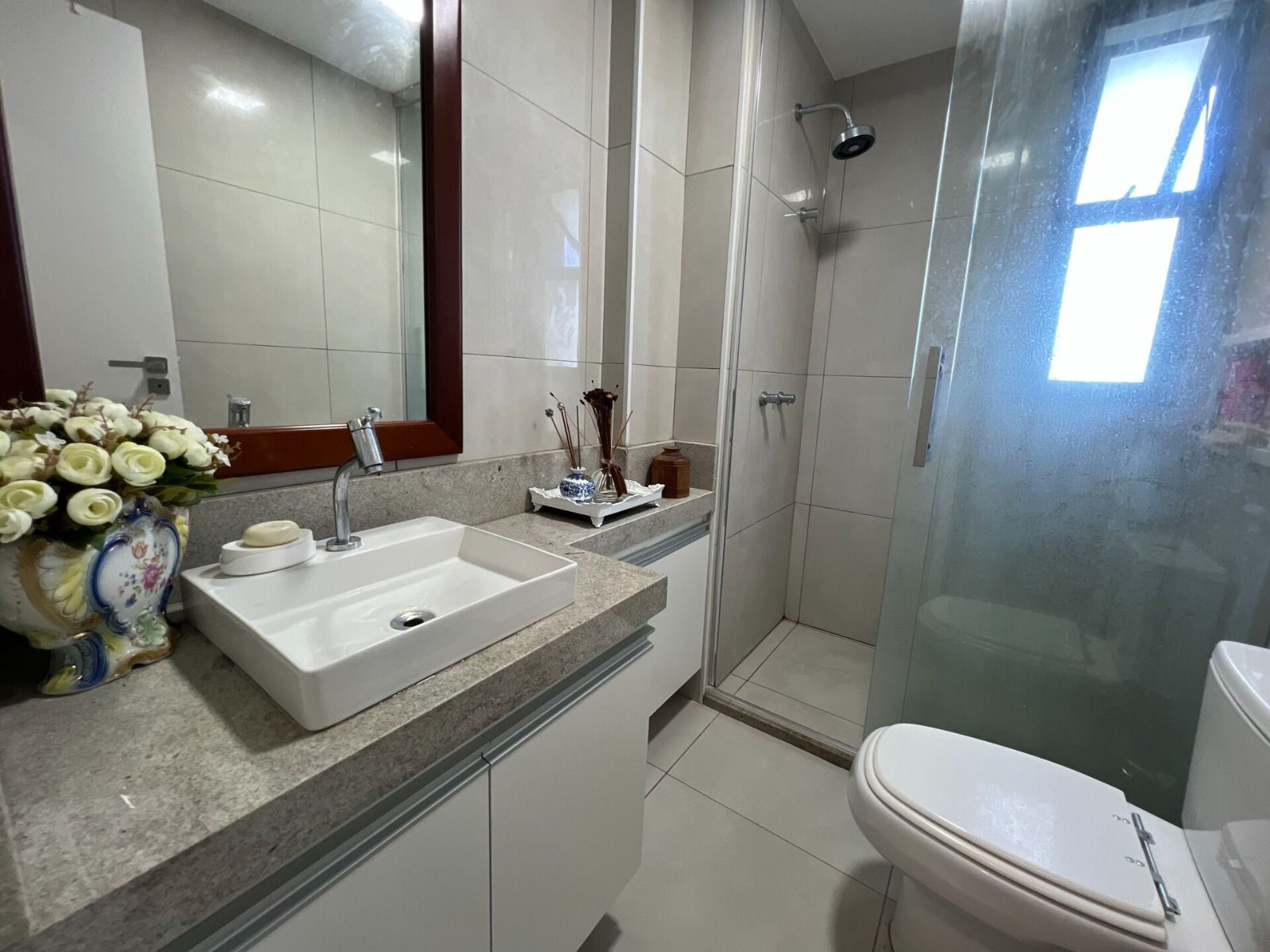 3 suítes bem distribuídas, sala ampla com varanda integrada e fechamento em vidro (Reiki), lavabo e cozinha equipada com cooktop.