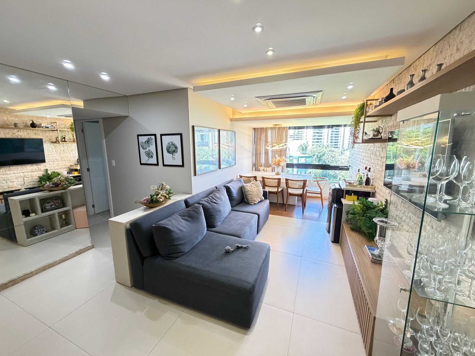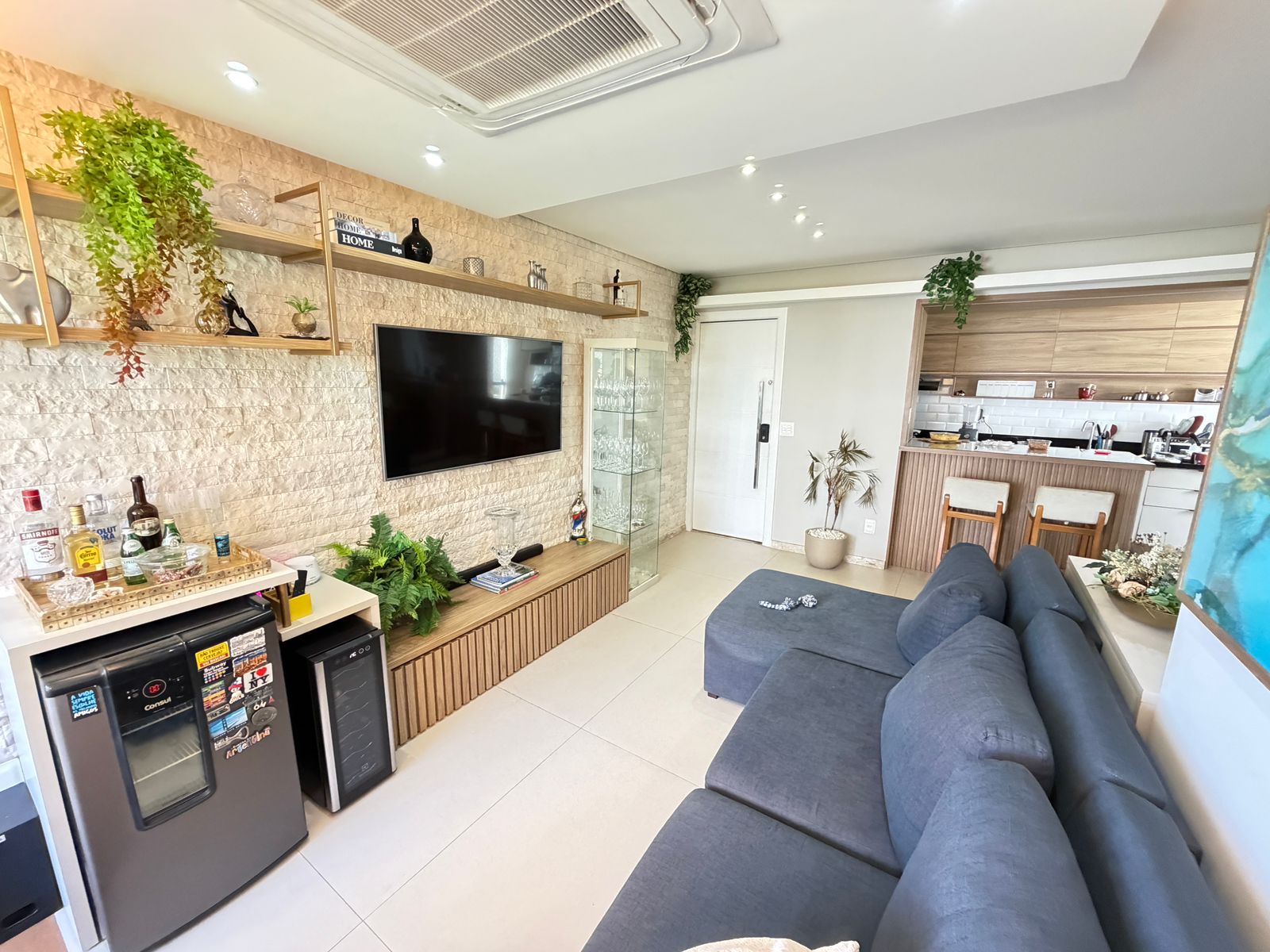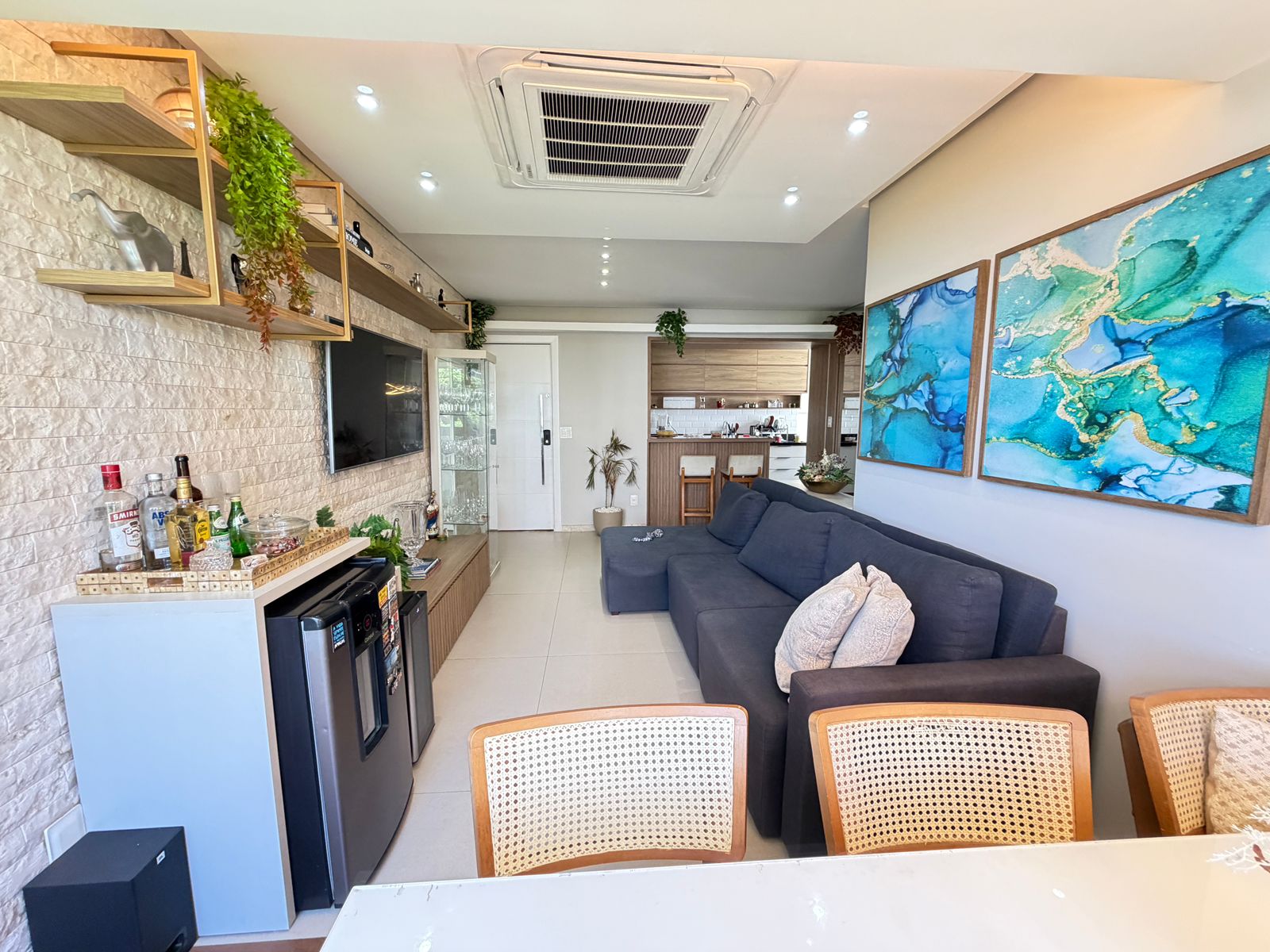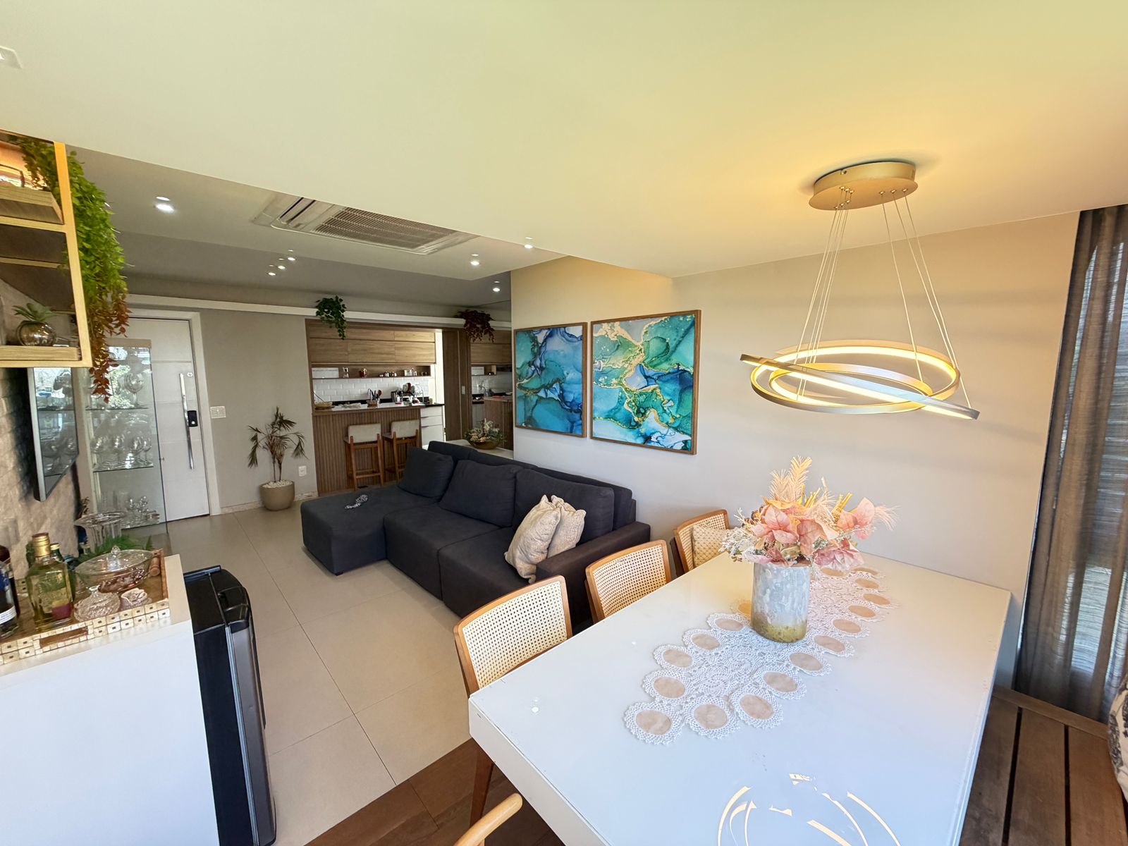 Apartamento com planta confortável e ambientes bem distribuídos. Possui varanda incorporada à sala com fechamento em reiki, cozinha americana, banheiro social, área de serviço com banheiro e porta de serviço. Conta ainda com armários em todos os cômodos, ar-condicionado central na sala e nos quartos, rebaixamento em gesso com projeto de iluminação e fechadura eletrônica.