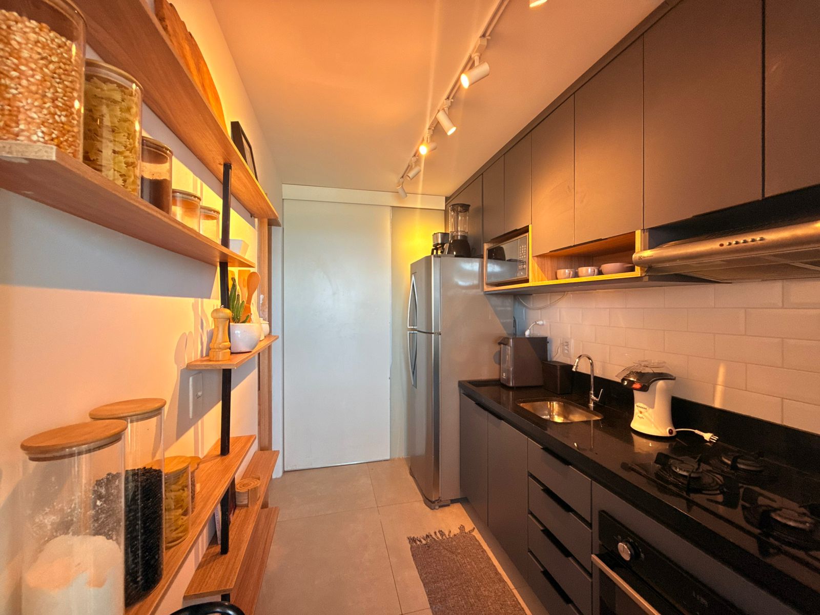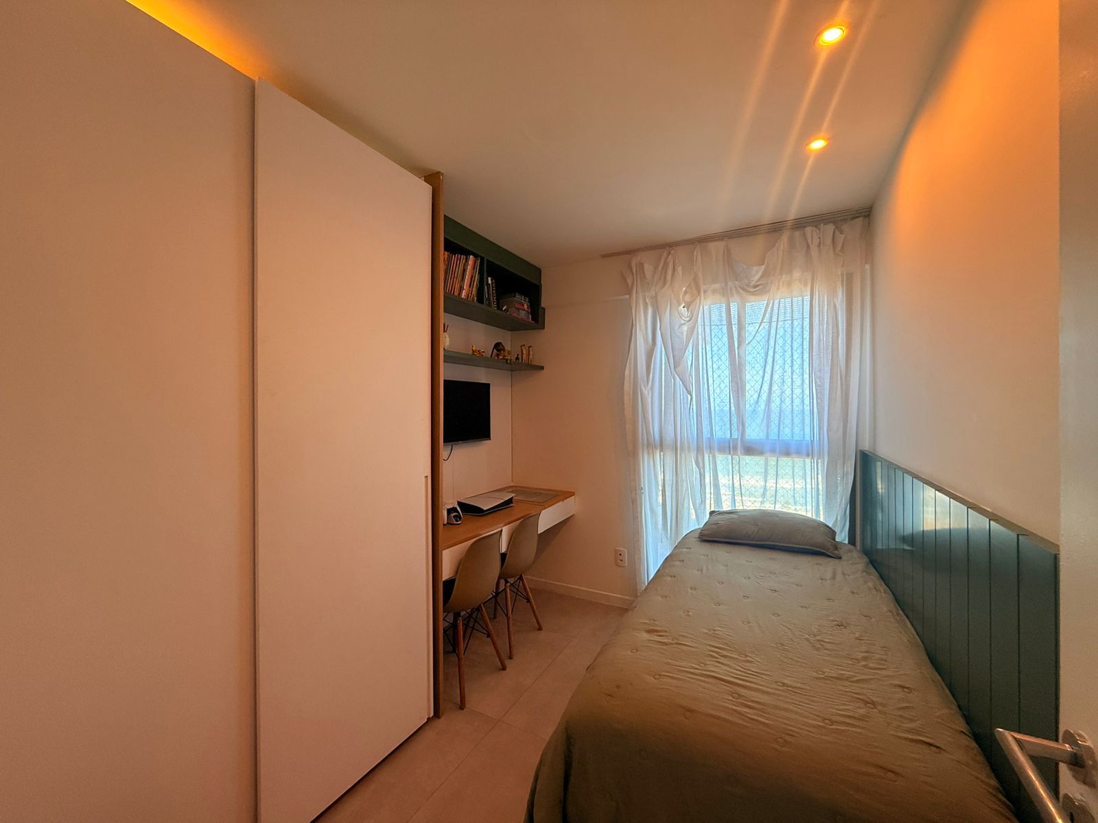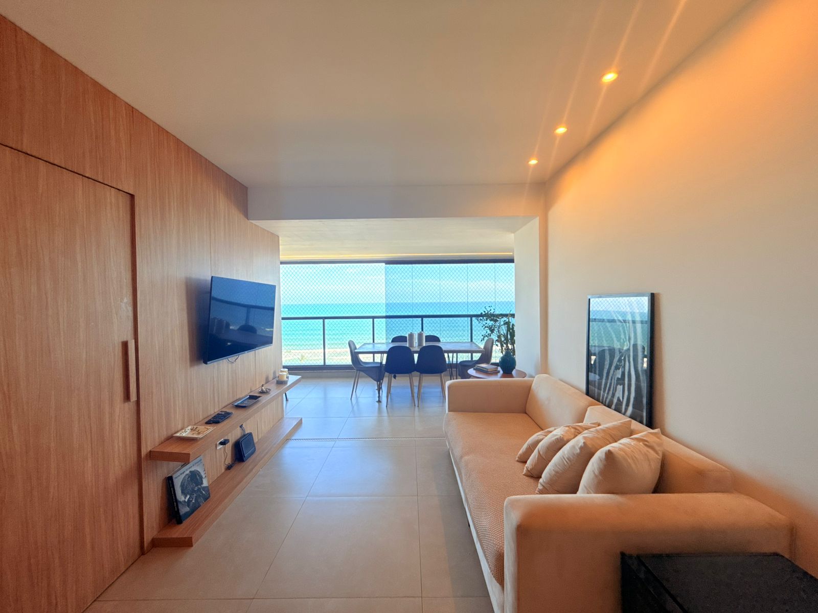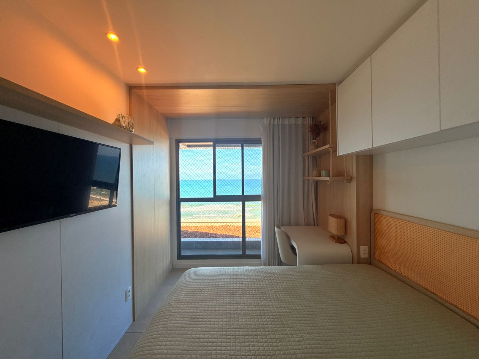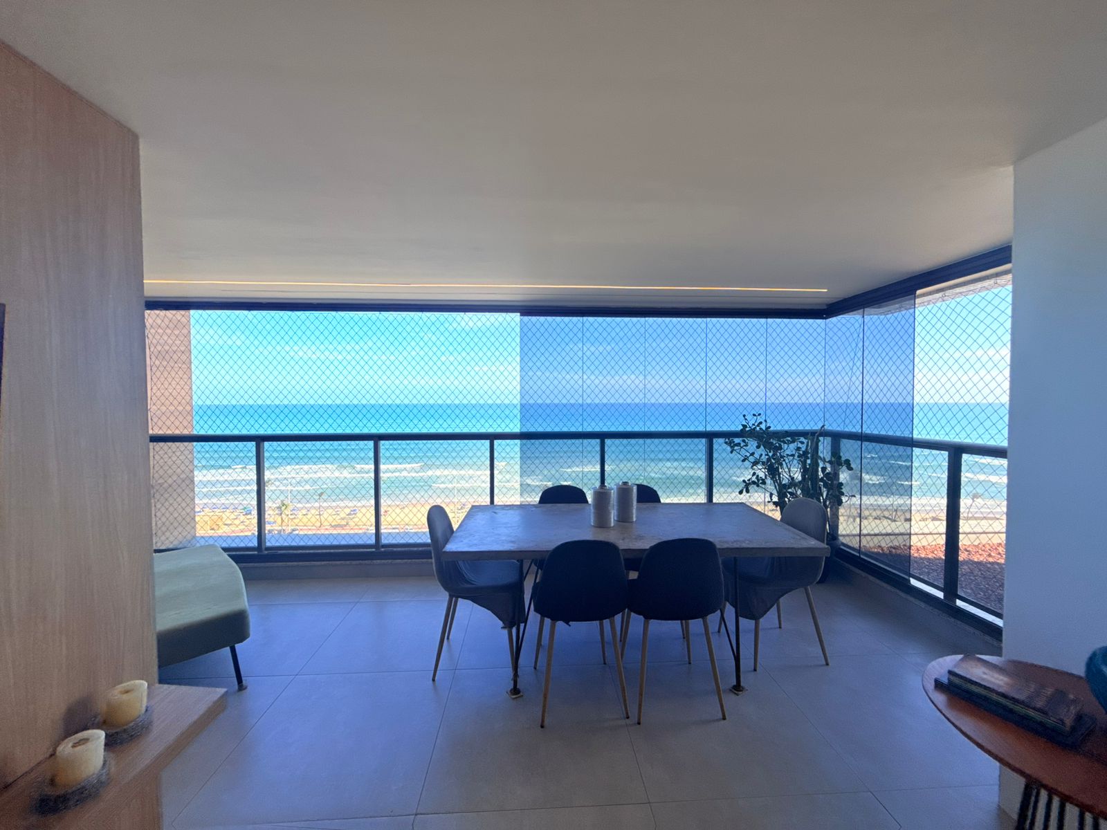 São 3/4 sendo 1 suíte, 88m², decorado, vista mar permanente, nascente, andar alto, varanda com fechamento de vidro, projeto de gesso e iluminação, armários planejados, 1 vaga de garagem.