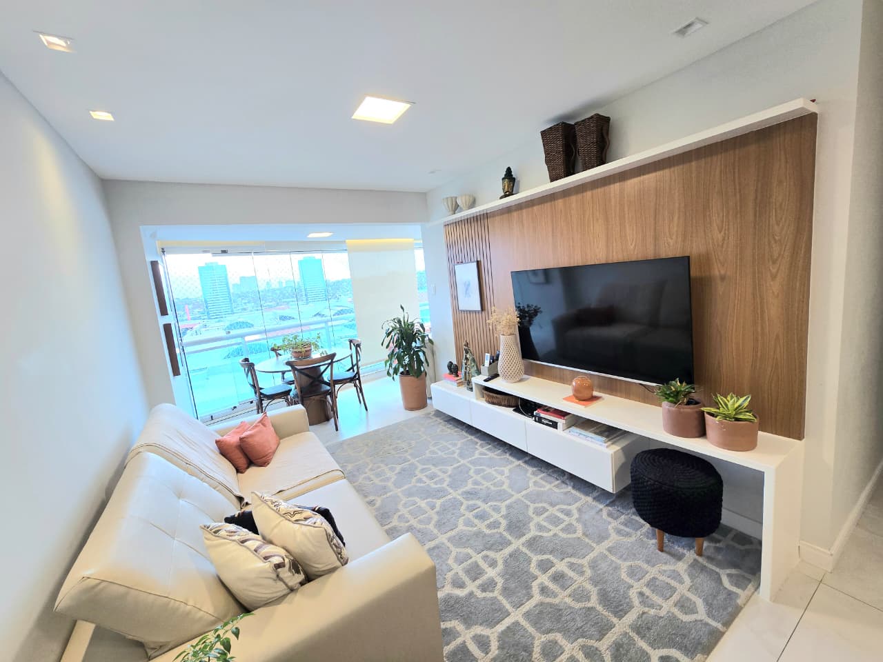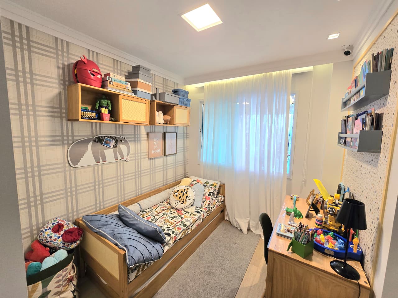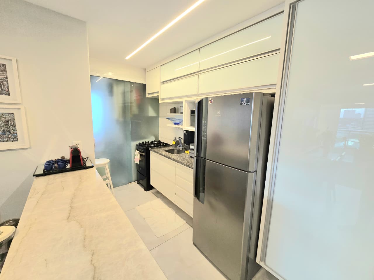 Acompanha: Geladeira, fogão, microondas, sofá, mesa de 4 lugares na sala de jantar, cama de casal na suite, ar-condicionado, armários planejados, cortinas, rede de proteção.