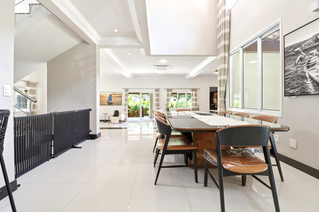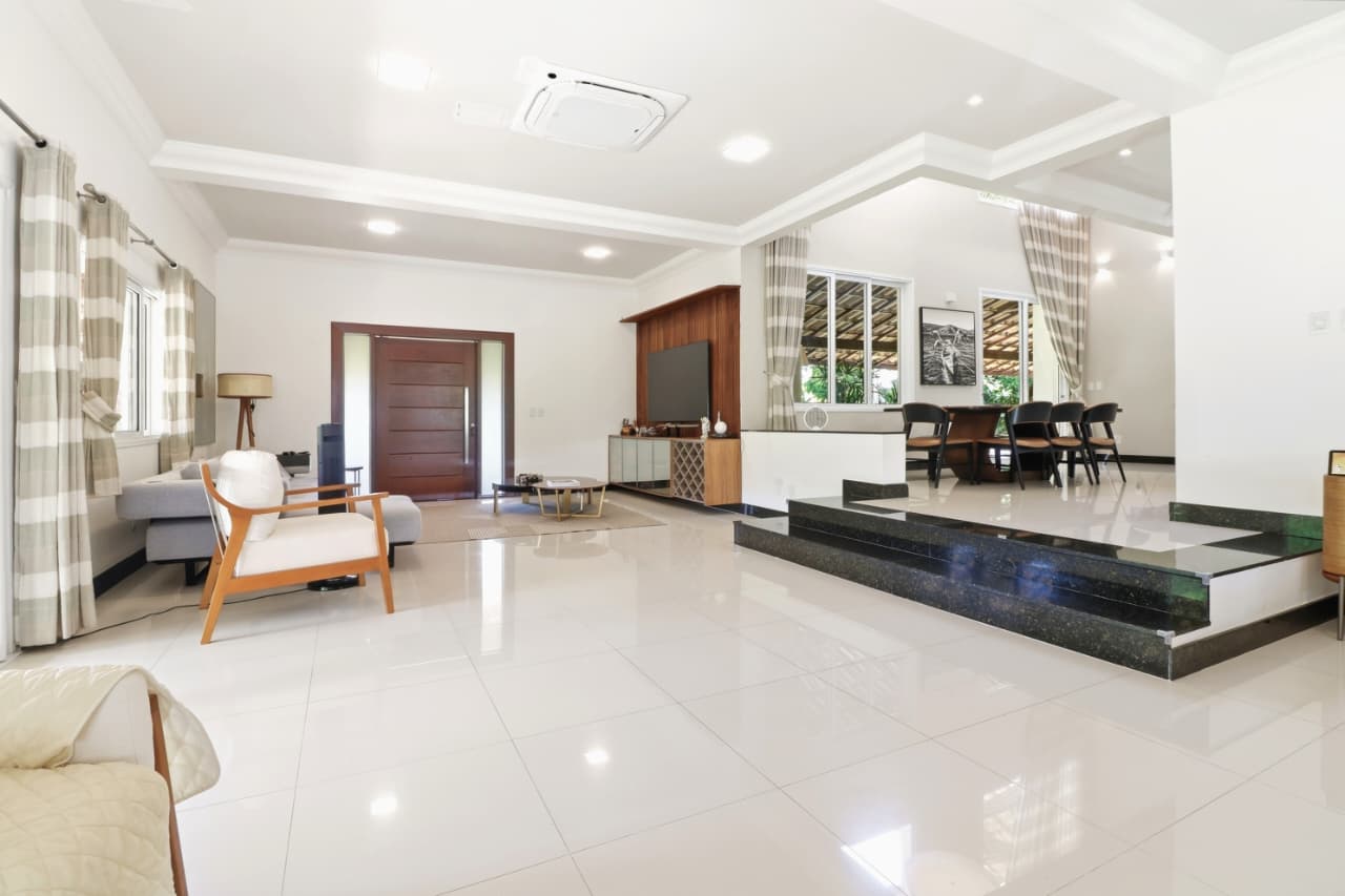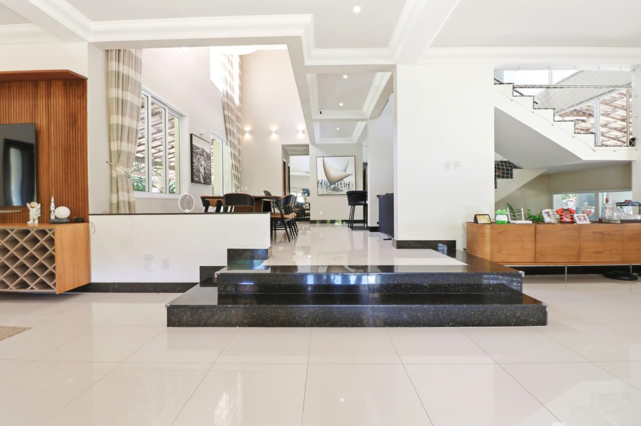 Sala ampla distribuída em três ambientes, com piso em porcelanato.