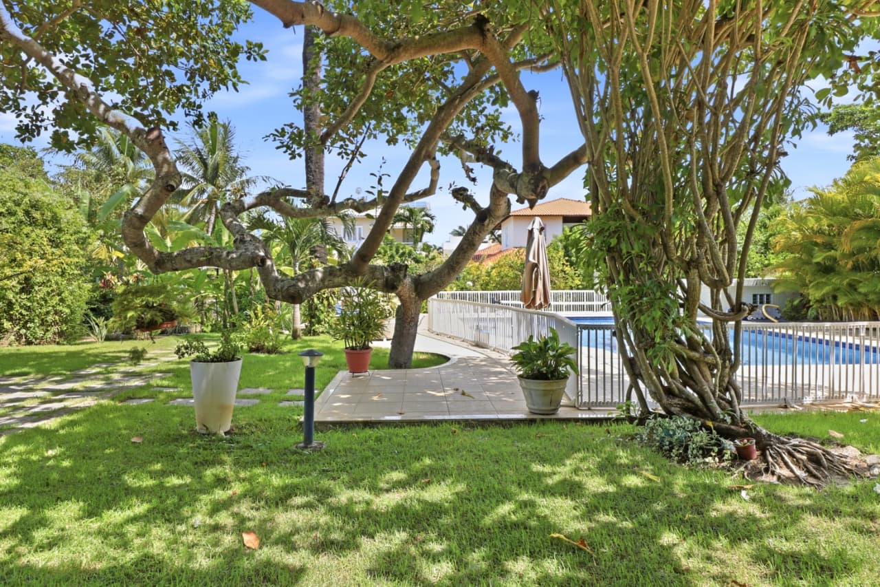 Área de lazer nos fundos com piscina, cascata, espaço de convivência e jardim.